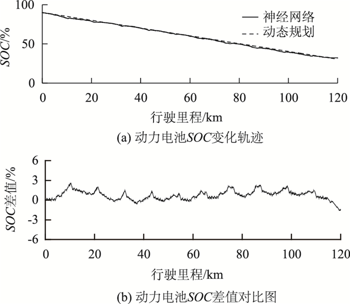 对行驶里程为120 km的NEDC工况采用上述训练方法得到神经网络控制模型。图 6为神经网络控制模型仿真结果与动态规划最优结果对比。其中图 6(a)实线为采用神经网络训练模型得到的动力电池SOC变化曲线,虚线为采用动态规划算法得到的动力电池SOC的最优变化曲线。图 6(b)为两种方式下动力电池SOC的差值。可以看出,神经网络训练模型能够控制动力电池SOC在目标值的3%误差带内,表明训练得到的控制模型具有较好的学习优度。
