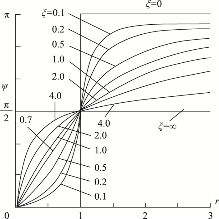 由式(6)可知,相角差仅与频率比和相对阻尼系数有关,以频率比r为横坐标,相角差ψ为纵坐标,根据系统不同的阻尼系数绘出一组相频响应曲线,如图 2所示。