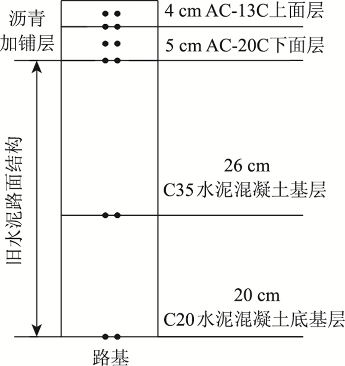 1 实测路面温度场分布规律 1.1 温度场测试技术方案温度场测试路段位于国道G321线广东佛山段,拟在由两层混凝土层构成的旧水泥混凝土路面上加铺沥青层。沥青加铺层采用4 cm厚AC-13C改性沥青混凝土上面层和5 cm厚AC-20C沥青混凝土下面层(图 1)。为保证温度场数据测量的可靠性,共选择8个代表性试验路段断面进行温度场测试,每个测试断面同一层位都埋设了间距为0.5 m的两个传感器,在路面改造施工过程中逐层埋设温度传感器。测试点布置在超车道的轮迹带处,传感器距离中央分隔带边缘2 m左右。测试点路面结构温度传感器布置如图 1所示。