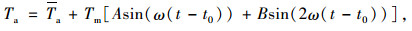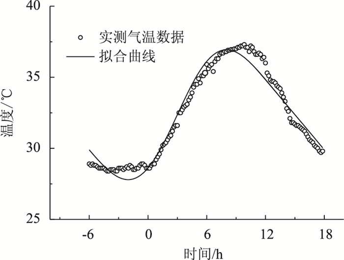 Barber[20]采用正弦函数来描述气温的日变化过程,严作人[6]采用双正弦函数模拟气温升温过程和降温过程不对称的情况,国内许多学者[13, 16-17]都直接采用严作人提出的双正弦函数表征气温作为模型边界条件。为了更好地模拟气温的日变化过程,本文对严作人提出的模拟气温的双正弦函数进行修正,即采用式(2)的修正双正弦函数对实测气温进行模拟,并根据实测的气温数据确定式(2)中的参数A和B。