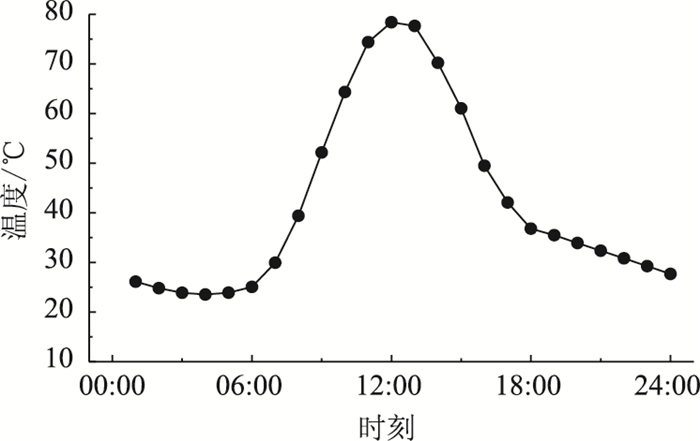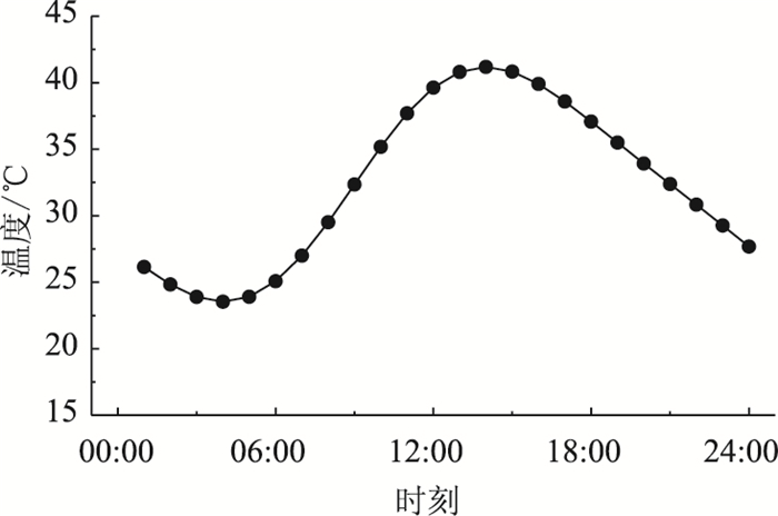 | 图 15 近路表热对流温度随时间变化 Fig. 15 Thermal convection temperature curve near pavement surface varying with time |