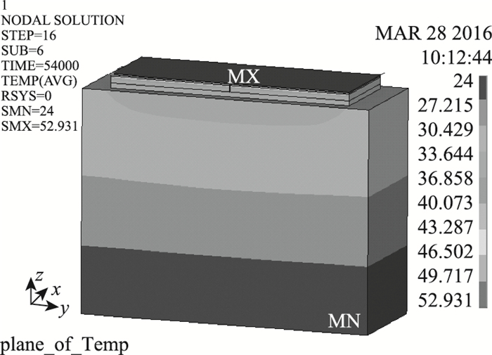 3 温度场数值模拟效果评价按照上述方法,对旧水泥路面加铺沥青层路面结构温度场进行数值模拟。在15:00时的路面结构温度分布云图如图 16所示,可见此时沥青加铺层温度非常高,路面结构层温度沿深度由上到下逐渐下降。