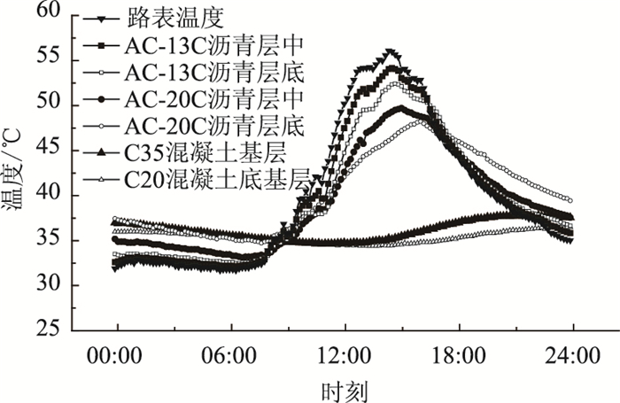 (2) 各路面结构层的温度峰值、峰谷出现时刻随着深度增加逐渐滞后,沿路面深度的温度峰值、峰谷时间滞后速率约为10 min/cm。沥青加铺层温度在14:00—15:00左右达到峰值。