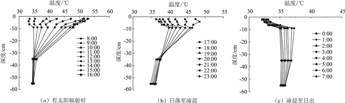 1.3 温度场沿深度的变化规律气温和太阳辐射等外界条件在一天中周期性变化,路面结构温度场随之发生变化。将一天分为有太阳辐射、日落至凌晨和凌晨至日出3个不同时期,图 6为路面结构温度在不同时期随深度的变化曲线。