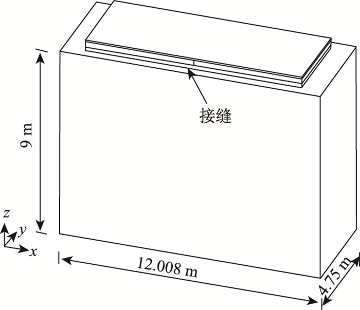 2.1 有限元模型的建立考虑太阳辐射、空气对流换热等路表与外界热交换的形式,根据传热学原理建立三维有限元分析模型(图 9),利用ANSYS有限元软件进行旧水泥路面加铺沥青层结构温度场数值模拟。根据旧路及拟定加铺层结构形式确定模型尺寸:沥青加铺层分为4 cm AC-13C上面层和5 cm AC-20C下面层;基层设为两块接缝宽度为8 mm的C35水泥混凝土板,每块板的尺寸为5 m×3.75 m×0.26 m(长×宽×高,下同);C20水泥混凝土底基层的尺寸为10.008 m×3.75 m×0.2 m。地基扩大尺寸取12.008 m×4.75 m×9 m,以表征其弹性半空间体特性。