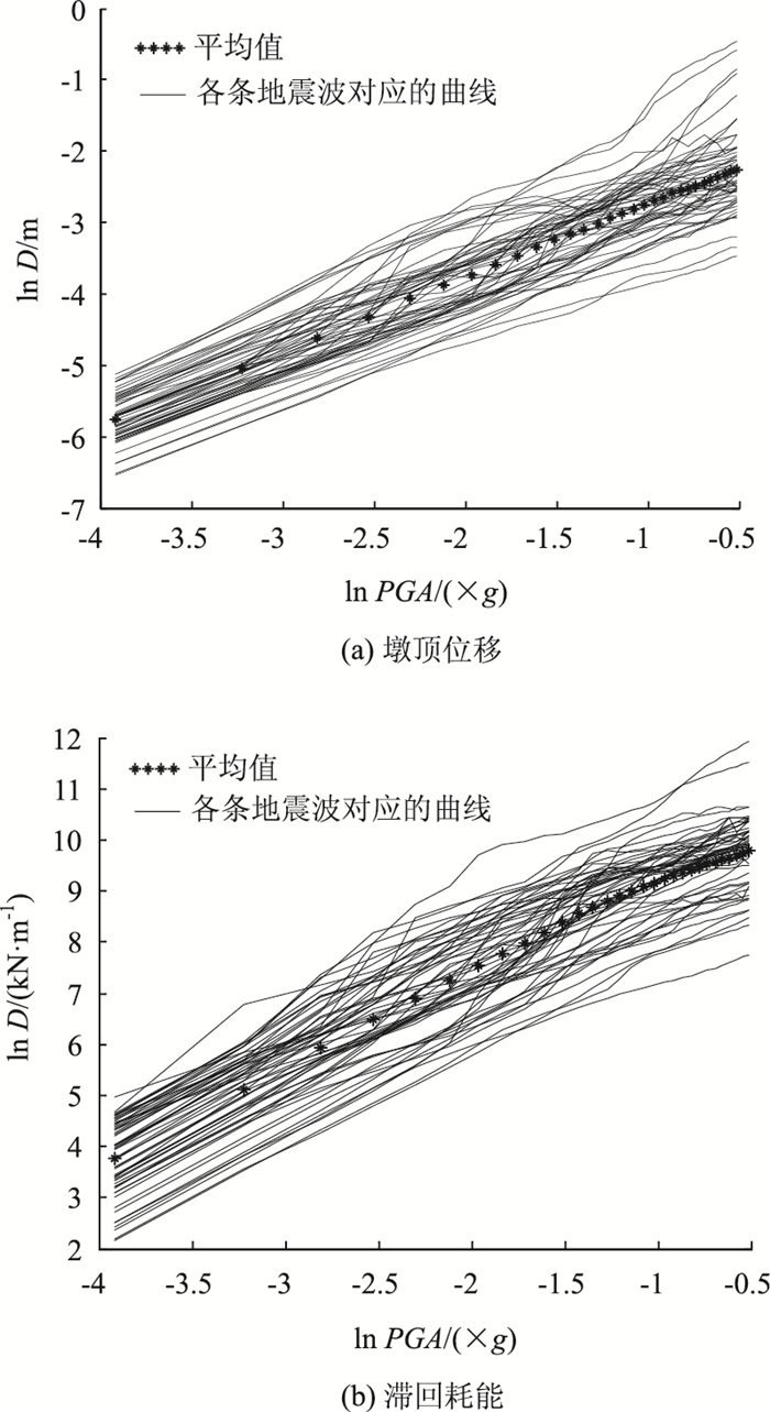 4.4 结构随机地震响应的概率统计分析对有限元模型作IDA分析,并以PGA的自然对数ln PGA为横坐标轴,以墩顶最大位移响应的自然对数ln D和滞回耗能的自然对数ln E为纵坐标绘制墩的IDA曲线,分别如图 3所示。