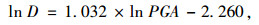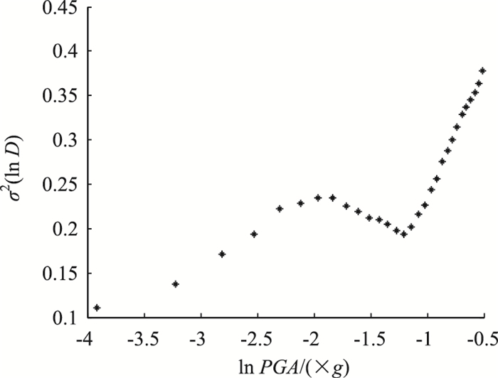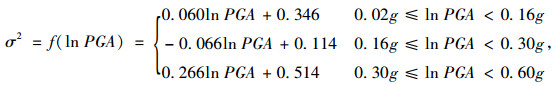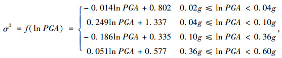 | 图 4 σ2(ln D)随ln PGA变化曲线图 Fig. 4 Curve of σ2(ln D) varying with ln PGA |