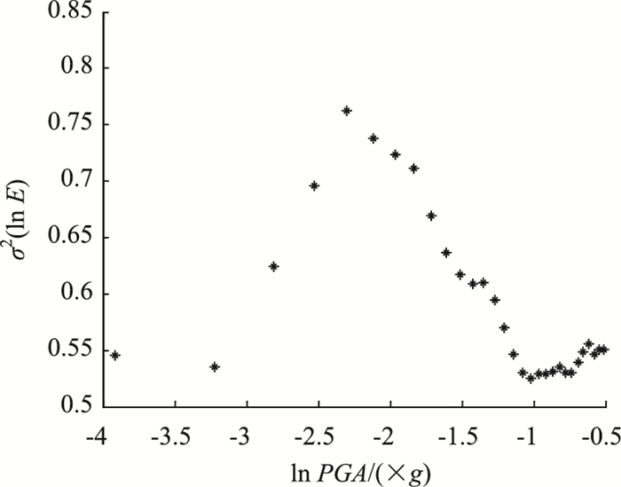 | 图 5 σ2(ln E)随ln PGA变化曲线图 Fig. 5 Curve of σ2(ln E) varying with ln PGA |