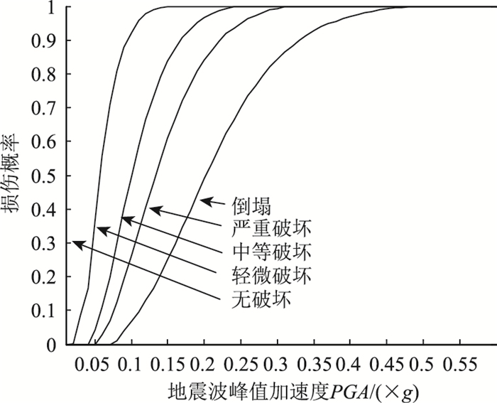 4.5 结构复合随机地震易损性曲线按照前文的分析步骤,并根据本研究中的连续梁桥结构实际,取β=0.2。应用蒙特卡罗法,随机产生5万组对应桥梁结构随机参数对结构的复合随机地震易损性进行分析,绘制易损性曲线如图 6所示。图 6中4条易损性曲线将桥梁的损伤状况分为5个区间,分别代表无破坏、轻微破坏、中等破坏、严重破坏和倒塌区间。从图 6中能够很容易地看出桥梁结构在复合随机地震作用下,不同损伤状况的超越概率。