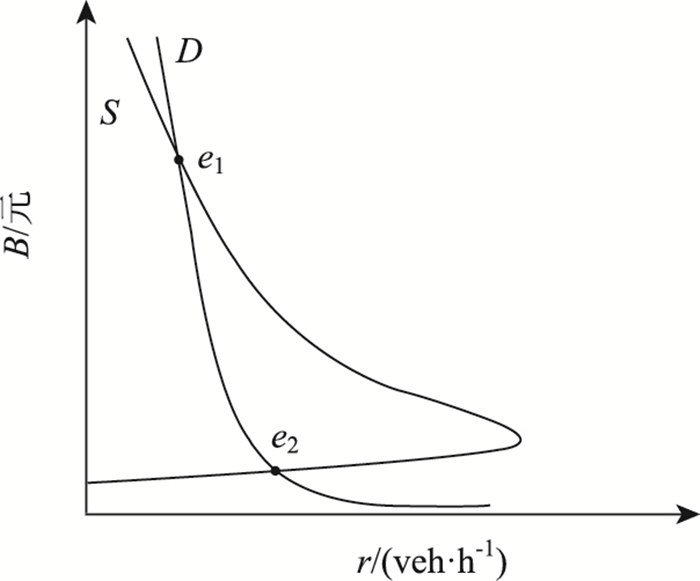 在经济学中,供给曲线与需求曲线的交点即是均衡点,此时所对应的停车资源能够得到高效利用,社会剩余达到最大[14]。满足路内停车容量次优的均衡点即是所要求的最佳点,如图 1所示,图中B为出行成本,D为需求曲线,S为供给曲线,e1和e2为均衡点。