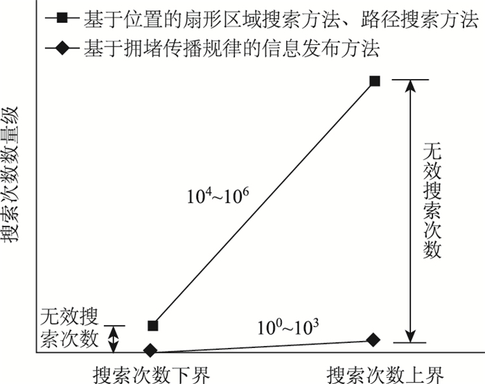 当一个城市每天在道路上行驶的车辆数的数量级为104~106,交通事件的数量级为100~103,则基于用户位置的扇形区域搜索的方法和基于路径的搜索方法搜索次数数量级为104~106,基于拥堵传播规律的信息发布方法的搜索次数数量级为100~103,数量级之间的差值属于无效搜索次数(如图 10所示),基于拥堵传播规律的信息发布方法能够大幅减少无效搜索次数。例如,当一个城市有10万辆车在路上,发生交通事件1 000次,那么基于位置的扇形区域搜索方法和路径搜索方法的搜索次数为10万次,基于拥堵传播规律的信息发布方法的搜索次数为1 000次,能够减少无效搜索9.9万次。