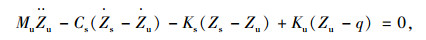 1.1 1/4车模型标准的1/4车模型如图 1中所示。非簧载质量代表了车辆减震器下部的底盘构件,簧载质量代表了减震器上部的构件。Ms为簧载质量;Mu为非簧载质量;Ks为车身悬架刚度系数;Cs为车身悬架阻尼系数;Ku为轮胎刚度系数;q为不平整激励;Zs为簧上质量Ms的绝对位移;Zu为非簧上质量Mu的绝对位移。