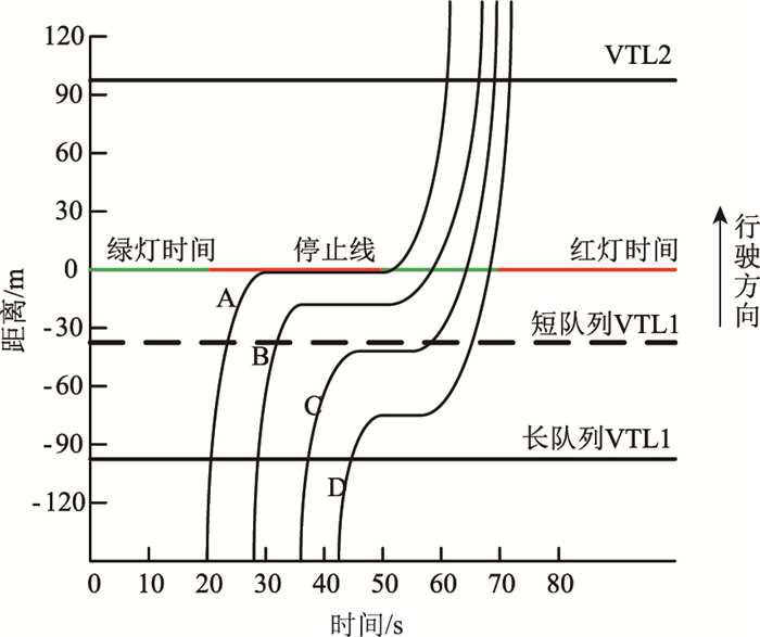 1 交叉口车辆的排队特点分析图 1描绘了一个信号交叉口中一部分车辆的行驶轨迹信息,X轴表示经过的时间,Y轴表示到停车线的距离(正值表示停车线的上游位置),长队列VTL1为当排队长度超过97.5 m时所设置的虚拟线圈检测器, 短队列VTL1为当排队长度大于37.5 m且小于97.5 m时所设置的虚拟线圈检测器, VTL2为设置在停车线另一侧97.5 m的虚拟线圈检测器,VTL1与VTL2共同组成了VTL区域。如果上游VTL1足够远,如图水平粗实线所示,距离停车线97.5 m,则到达流量可视为自由流量;如果上游VTL1靠近停车线,如图水平粗虚线所示,距离停车线37.5 m,则认为通过上游VTL1的车辆受到未检测到的交通流干扰。