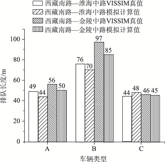 从表 2中可以看出,两个交叉口各类车型模型的计算值和仿真真值最大误差为12 m,最小误差为1 m,如图 5所示。此外,本研究模型的绝大部分计算结果较仿真真值偏小,可能是由于:(1)上述所研究交叉口位于上海市黄浦区中心地带,道路通行能力无法满足庞大的交通量,在高峰时段经常有交警进行交通疏导,与交通信号控制产生一定的冲突;(2)采集数据由于技术手段原因可能存在部分遗漏,造成误差,使得VISSIM仿真结果较大;(3)平均到达率小于实际到达率,排队长度估计偏大。