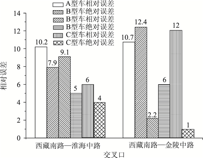 相对误差方面,两个交叉口各类车型最大相对误差为12.4%,最小为2.2%;平均为8.75%,方差为12.595%2,如图 6所示。具体而言,西藏南路—淮海中路交叉口本研究模型与真值的最大相对误差为10.2%,最小为7.9%;平均为9.1%,方差为1.32%2;西藏南路—金陵中路的最大相对误差为12.4%,最小为2.2%;平均为8.4%,方差为29.9%2。此外,西藏南路—淮海中路的相对误差起伏不大,较为贴合平均值;而西藏南路—金陵中路的相对误差起伏较大,偏离平均值较大,但在可接受范围内,可能是由于:(1)西藏南路—金陵中路交叉口调查期间,周边存在地铁14号线的施工,部分交叉口进口道占用封道,造成通行能力下降;(2)部分进口道没有设置非机动车专用车道,在机动车与非机动车同时放行相位期间产生冲突,机动车通行能力下降;(3)VISSIM仿真软件中计算排队长度的模型对各项数据的精度要求高,数据采集时存在一定的误差,模型的参数标定亦有可能对结果产生影响;(4)两个交叉口之间的直线距离无法保证车辆在相邻交叉口顺畅行驶。