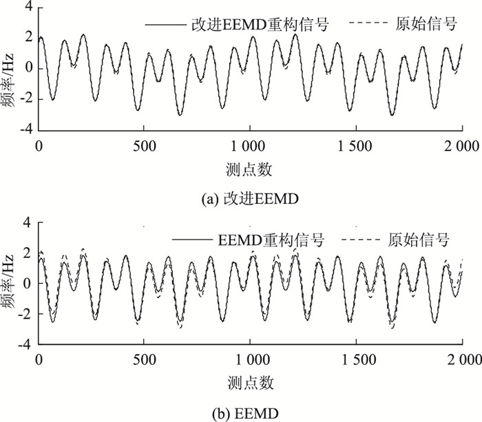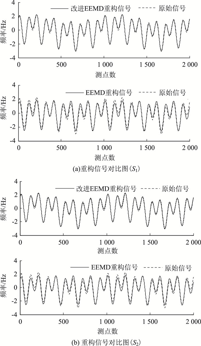 基于第4节的分解流程,分别采用EEMD算法和改进EEMD算法对叠加信号s1(t)和s2(t)进行分解和重构。两种分解算法所得重构信号如图 10所示,其中EEMD算法重构所得信号与原始信号间的关联度系数分别为0.83和0.85;改进EEMD算法重构所得信号与原始信号间的关联度系数分别为0.95和0.94。这表明改进EEMD算法适用于不同噪声水平的信号,且分解的效率较既有EEMD算法更高。