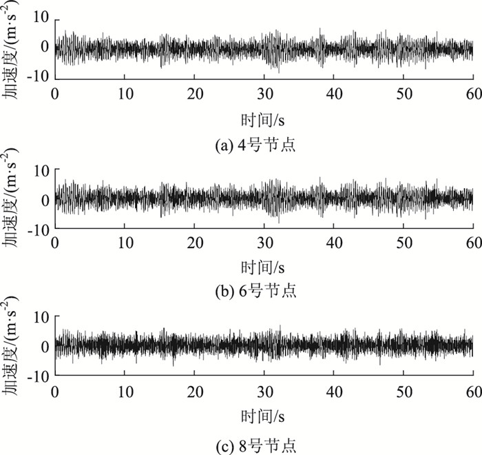 6.3 各节点的动力响应信号因篇幅有限,仅给出节点4、节点6及节点8在采样时间段内的加速度响应时程曲线图,见图 13所示。