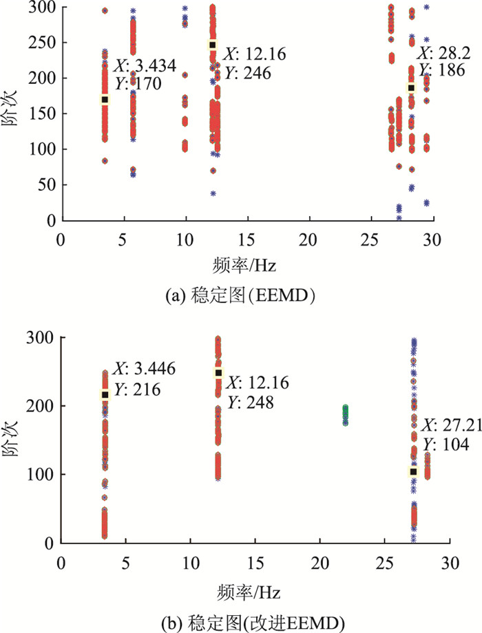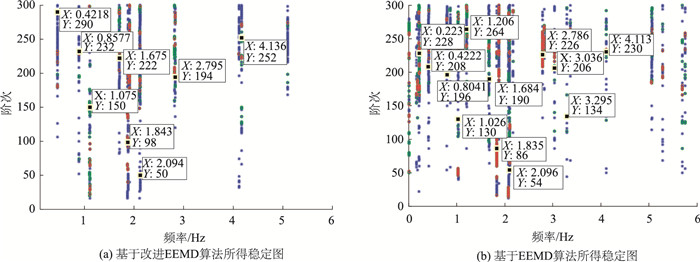 采用随机子空间算法识别两种分解算法所得重构信号,得到各自对应的稳定图,结果如图 18所示。对比两图可知:基于改进EEMD算法得到的稳定图中频率轴更为清晰;且基本不存在虚假模态,表明改进EEMD分解算法能够有效地剔除环境激励信号中的无用信息,更为真实地保留桥梁结构自身的结构信息。