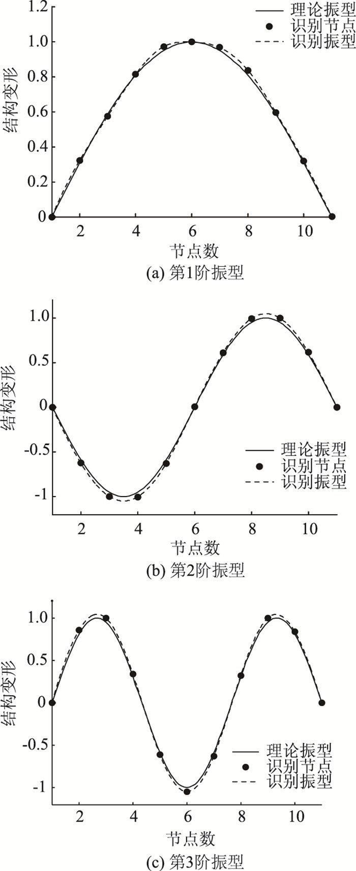 为验证改进EEMD算法能够识别该简支梁结构的模态振型图,得到了其前3阶模态振型图。图 15为所得模态振型图与理论振型结果的对比图,其中横坐标为节点编号,纵坐标为经标准化处理后的结构变形结果。可知识别所得前3阶模态振型图均与理论振型图具有很高的相似度。