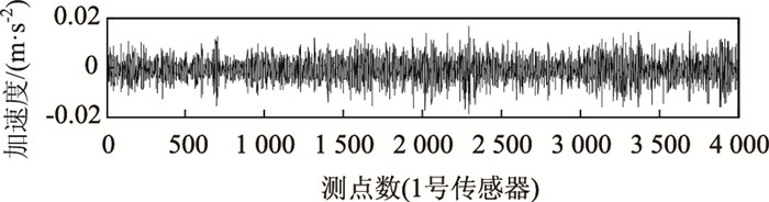该斜拉桥桥长共628 m,其中主跨为330 m,两边跨均为149 m,桥面净宽18 m。其结构体系为双塔扇形双索面的塔梁分离悬浮体系,桥上总共布置11组加速度传感器,主梁上的圆圈为传感器大体布置位置。传感器的信号采样频率为20 Hz,图 16为某传感器采集到的时长为200 s的主梁加速度响应时程曲线图。