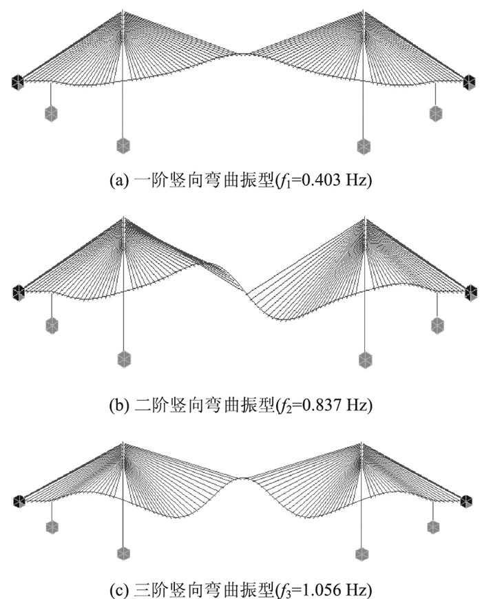 为了获得该斜拉桥的真实固有频率值,已有相关检测单位通过在主梁的主跨跨中采用跳车激振的方式对其产生一定的激励,并基于传感器收集的主梁振动脉冲信号进行分析识别得到了其自振频率。图 17为该斜拉桥的前3阶模态振型结果。