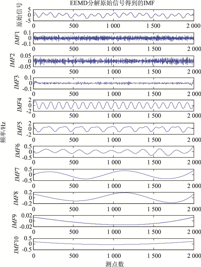 对叠加信号s(t)进行EEMD分解,分解结果见图 5,图中第1行为原始信号的时程曲线图,共分解得到10个IMF分量。