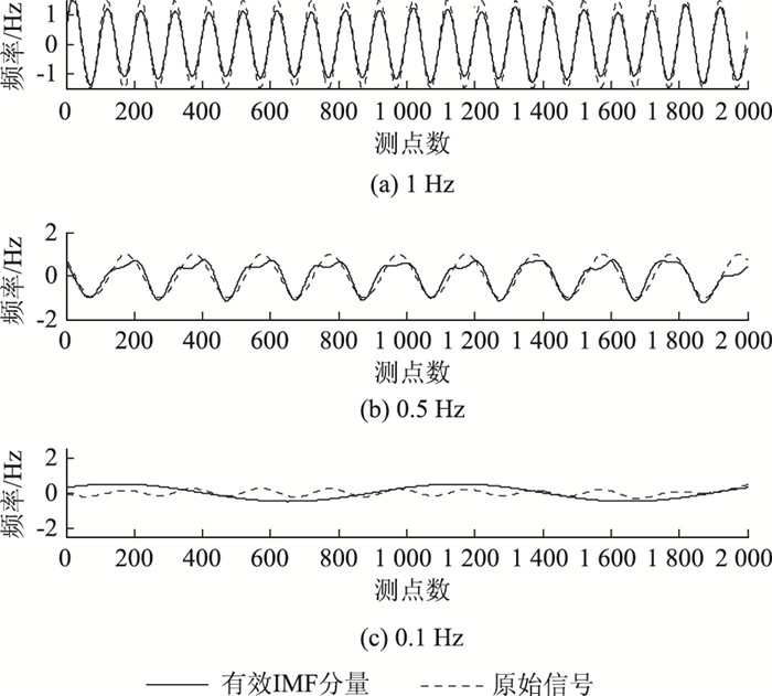 将所得有效IMF分量与混合信号中的各组成信号作对比,结果如图 6所示。其中有效IMF4分量与1Hz正弦信号的关联度系数为0.89;有效IMF5分量与0.5Hz余弦信号的关联度系数为0.83;有效IMF5分量与0.1Hz正弦信号的关联度系数为0.63。