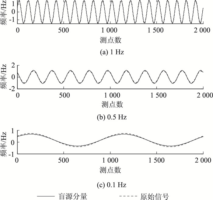 基于3.3节所提算法,对上述所得IMF4,IMF5,IMF6 3个有效分量进行Fast-ICA算法处理,并将所得结果与原始信号中的各叠加信号做对比,结果如图 7所示。其中有效IMF4分量对应的盲源分离结果与1 Hz正弦信号的关联度系数为0.98;有效IMF5分量对应的盲源分离结果与0.5 Hz余弦信号的关联度系数为0.97;有效IMF5分量对应的盲源分离结果与0.1Hz正弦信号的关联度系数为0.93。