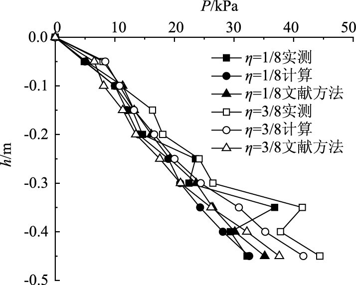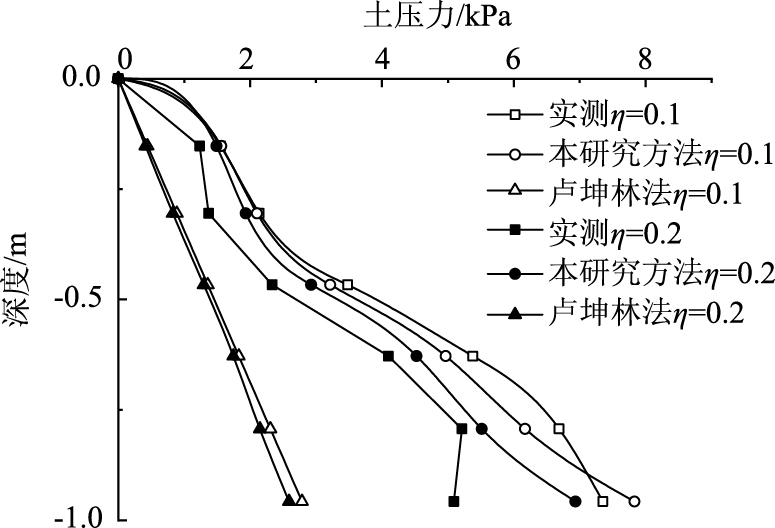 4.2 实例验证 4.2.1 非极限主动土压力Fang[22]试验的试验条件如下:刚性挡土墙墙背直立,墙高h=1.0 m,填土为干砂,填土面水平无超载,γ=15.4 kN/m3,内摩擦角φ=34.0°,取δ=2φ/3,r=0.85,进行分析计算时分别取η=0.1、η=0.2。图 10为本研究计算结果、卢坤林方法[12]与试验实测结果的比较。