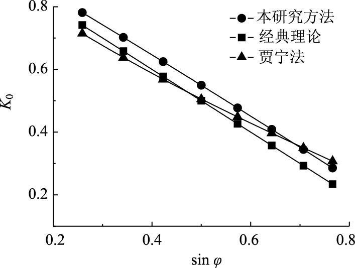 4 验证分析 4.1 边界条件验算当挡土墙位移为0时,土体处于静止状态,图 7所示为本研究方法、经典理论(为简化计算,采用摩擦角代替有效摩擦角,因此,计算结果偏小)与贾宁法[21]对静止土压力系数的计算结果比较。