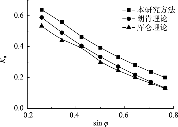 当挡土墙向离开土体方向发生位移达到极限状态时,土体处于主动状态。图 8所示为本研究方法与库仑理论和朗肯理论在计算主动土压力系数时的比较结果。