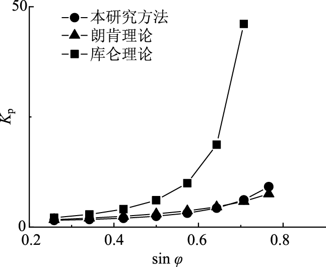 当挡土墙向土体方向发生位移达到极限状态时,土体处于被动状态。图 9所示为本研究方法与朗肯理论、库仑理论在计算被动土压力系数时的比较结果。