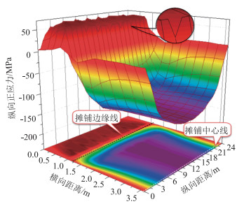 摊铺引起的温度应力主要集中分布于摊铺区域附近。图 14表示的是顶板纵向正应力达到最大值时(1 790 s)三维分布图和水平投影图,横向距离原点为距摊铺边缘线1.2 m处,纵向距离原点为摊铺起点。可以得到:(1)位于摊铺区域的顶板主要受压应力,其纵向正应力由摊铺中心线沿两侧向摊铺区边缘横向递减,同时纵向正应力在纵向上由跨中截面向两侧递减,最大压应力位于摊铺中心线处跨中截面附近,最大压应力温度增量为139 MPa;(2)位于非摊铺区的顶板主要受拉应力,以距摊铺区边缘线0.36 m处顶板为例,最大拉应力温度增量为70 MPa;(3)纵向正应力分布三维图中锯齿形是由顶板下方横隔板导致,致使横隔板处顶板的纵向正应力有着规律性的降低,约为8 MPa。