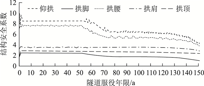 由图 5可以看出,仰拱、拱脚、拱腰、拱肩及拱顶等部位的安全系数在隧道建成初期有短暂的调整,中期是相对漫长的稳定状态,后期安全系数逐渐降低,一直到最不利位置的安全系数降至2.0以下,隧道寿命共延续130~140 a。