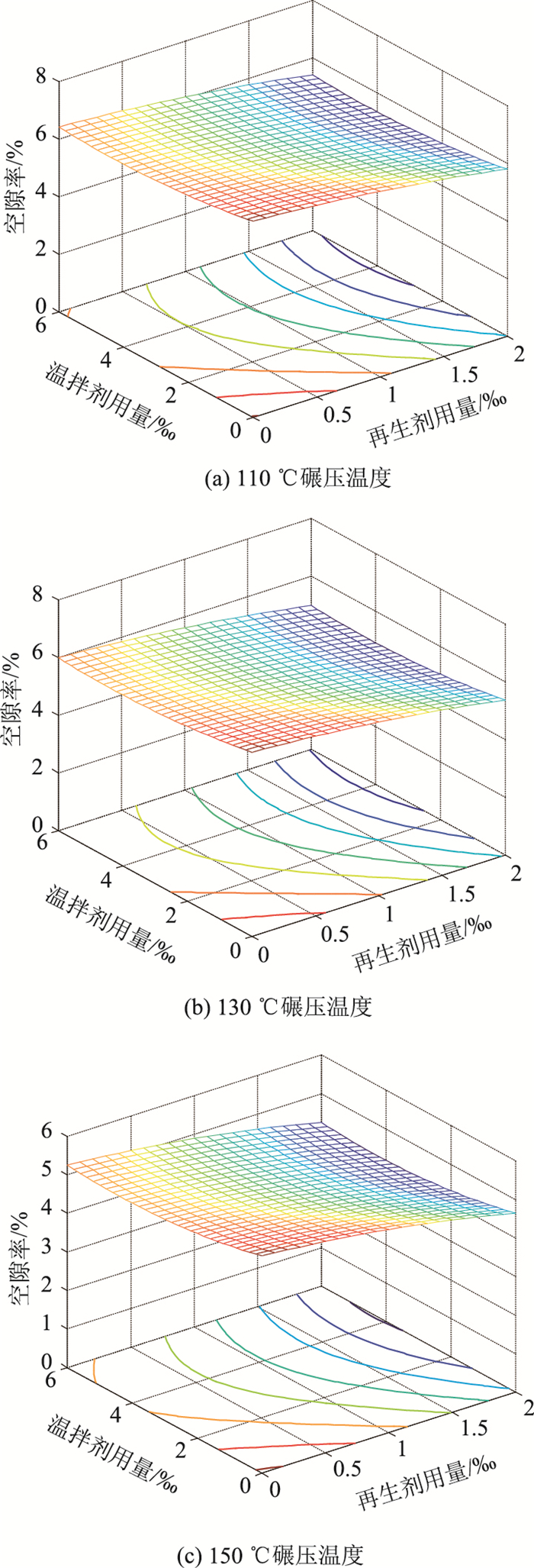 由表 11可知,纯二次模型拟合空隙率指标的拟合优度与剩余标准差最优,拟合模型见式(9);交叉模型拟合的冻融劈裂抗拉强度比指标的拟合优度与剩余标准差最优,拟合模型见式(10)。并根据公式(9)、式(10)分别分析空隙率、冻融劈裂抗拉强度比在不同碾压温度情况下随再生剂、温拌剂的变化趋势,结果如图 4、图 5所示。