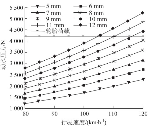 图5 轮胎所受动水压力随水膜厚度和速度的变化曲线 Fig.5Curves of hydrodynamic pressure varying with water film depth and speed |