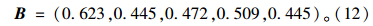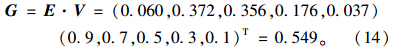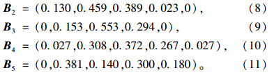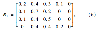 同理得到以下其他所有第一级风险因素大小的模糊矩阵,最后将其量化。评价等级向量为(0.9,0.7,0.5,0.3,0.1)T。