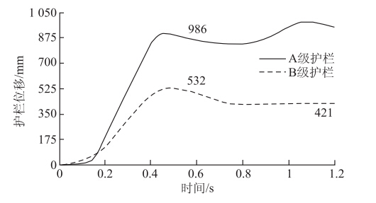 护栏的最大动态变形量也是评价护栏防护性能的一个重要指标,由于客车具有质量大、惯性大的特点,与护栏相撞往往会使护栏产生大变形甚至冲出护栏,这些对客车的危害是相当巨大的。如图 11所示,仿真分析得到两种护栏的最大动态变形量分别为532 mm和986 mm。两种护栏的最大动态变形量均小于法规规定的1 000 mm,但A级护栏的最大变形量逼近法规允许值,防护性能较差。A级护栏的位移曲线有两个波峰,是因为客车的车头和车尾分别与护栏发生了碰撞。
