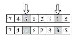 定义pm∈(0,1)为变异概率,为了选择实行变异操作的染色体,从i=1到pop_size重复下列过程:在区间(0,1)中产生一个随机数r,若r≤pm,则选择当前染色体,采用对换变异的方法进行变异操作。对换变异示例如图 4所示。