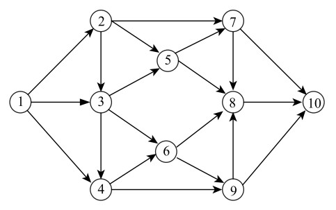 这里给出一个实例来验证本文所建立的模糊环境下应急物资配送问题的机会约束规划模型及算法的有效性和实用性。图 5为应急物资配送网络图,节点10处发生了自然灾害,而节点1处储存大量的救援物资,现需找出一条较优的配送路径,尽快将救援物资从物资储备点运送到受灾地区。