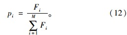 最后,根据各个个体的适应度值大小,使用改进的轮盘赌法确定进入下一代种群的个体。改进的轮盘赌法在选择新个体时,首先在当前种群中随机选择一个最优的个体直接进入下一代,其它个体的选择根据其适应度大小,用轮盘赌方式决定是否进入下一代。例如,设当前种群中有M个个体,各个个体的适应值为F1,F2,…,Fm,则各个个体被选中进入下一代的概率如式(12)所示: