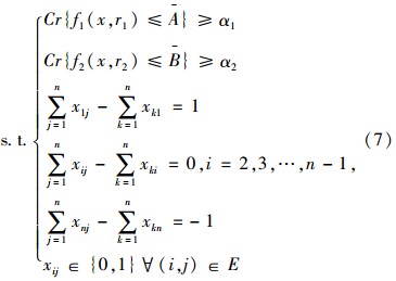 这里所选择路径的走行时间、路径风险能够满足一定的置性水平,那么模糊环境下应急物资配送问题的机会约束规划模型[4]如式(7)所示:
