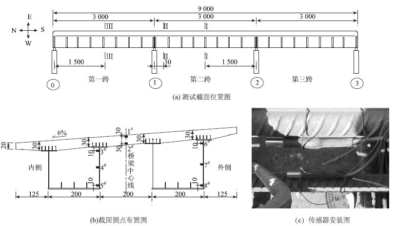 为掌握横截面上的温度变化,在钢-混凝土组合梁桥第一跨、第二跨跨中及1#墩墩顶截面上埋设温度传感器测量温度场,其中在混凝土中布置2个测点、钢箱梁中布置6个测点,具体测试断面、测点布置及传感器现场安装情况见图 1。