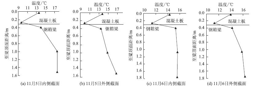 (5)钢箱梁截面上的温度分布规律为:除11月5日内侧钢梁表现出腹板中部温度高于腹板上、下部以外,其余均表现出腹板下部温度最高、中部次之、上部最低的规律。这种规律在外侧钢箱梁表现得更明显一些。