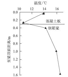 (4)从各时刻的温度梯度可看出:混凝土下表面和钢箱梁上表面两测点虽然距离较近,在此局部范围内存在一定的温差。钢箱梁上部测点的温度要比混凝土下表面温度高一些。这种温差在早晨温度较低时尚不明显,随着大气温度的升高温差逐渐变大,最大可达3 ℃左右。这是由于混凝土下表面较环境温度滞后较为明显,而钢梁对温度的反应则更敏感一些。
