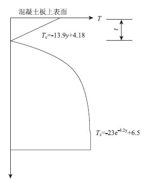 | 图 6 拟合的温度梯度模式 Fig. 6 Fitted temperature gradient mode注:Tc为混凝土截面温度梯度曲线;Ts为钢箱梁截面温度梯度曲线;t为混凝土桥面桥厚。 |