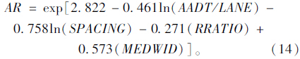国外关于立交间距对道路安全性的影响研究较为透彻,美国联邦公路局(FHWA)通过对加利福尼亚州95个不同立交间距5 a的事故数据进行分析,得到以下事故预测模型[9]: