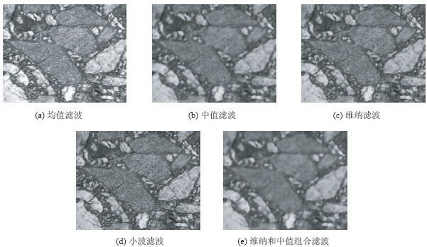 如图 5所示,对比不同方法的滤波效果可以看出,维纳滤波结合中值滤波的去噪方法能够较好地去除集料内部所产生的噪声点,使集料灰度分布更加均匀,灰度值趋于一致,同时保持了清晰的集料边缘,这将有利于不同组成部分的图像分割。