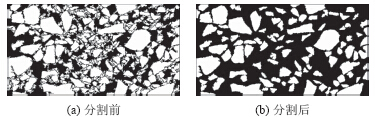 按照等效半径圆面积提前筛选出2.36 mm以上的粗集料颗粒,如图 6(a)所示。分割后粗集料见图 6(b)所示。