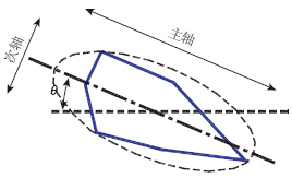 大量统计结果表明,碎石集料大致呈椭圆形的形状,因此用等效椭圆的长轴和短轴来表示集料的扁平程度,用集料长轴倾角表示集料方位,见图 7。按照图 7对分割后的集料倾角和集料的主次轴比值进行了统计,并对两者之间的相关性进行了分析,见图 8。